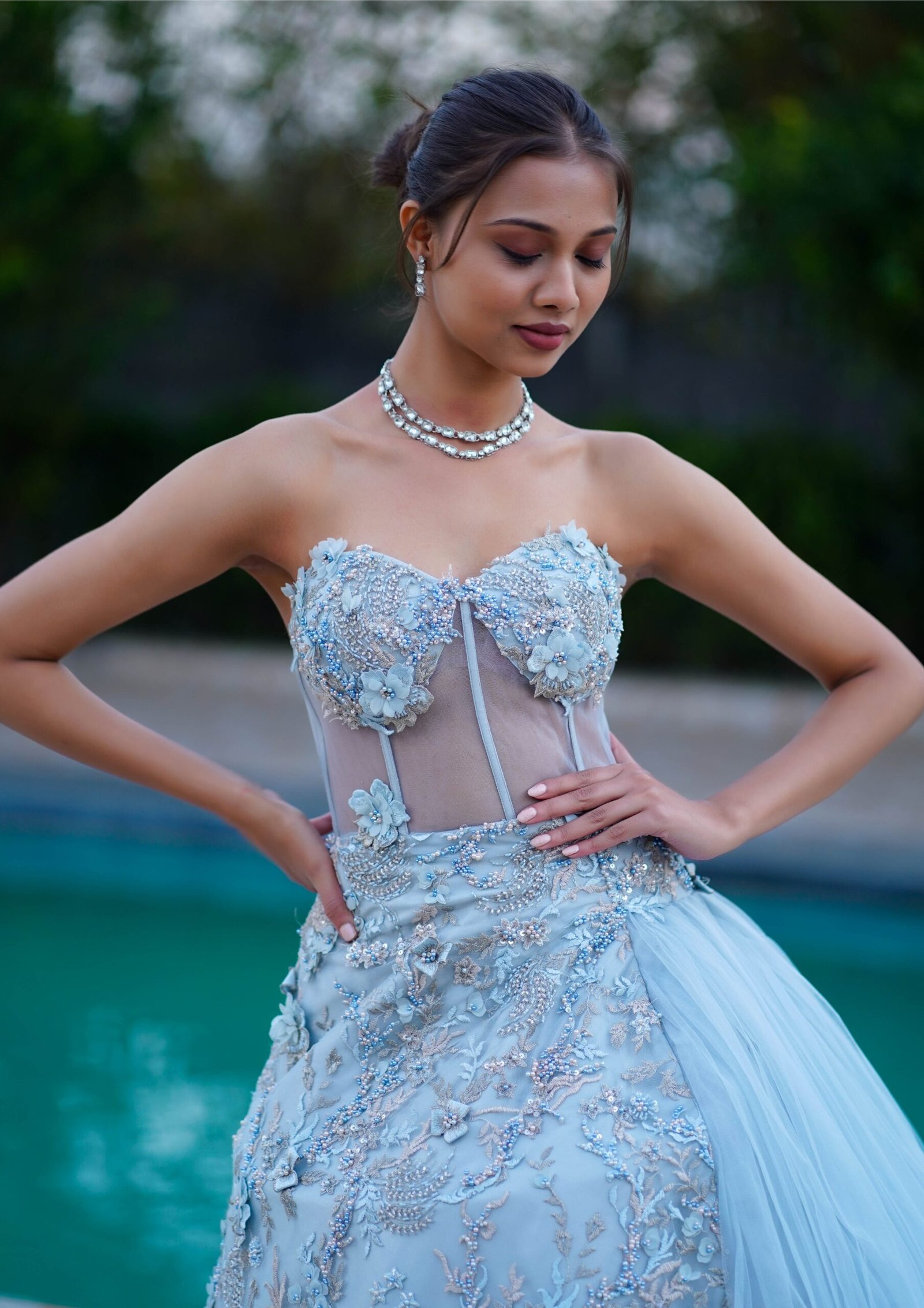 The VAINMUNE Celeste Embroidered Tulle Couture Gown is a stunning statement piece crafted with delicate embroidery and soft layered tulle. Featuring a structured strapless bodice and an elegant asymmetrical tulle drape, this gown blends modern couture with timeless elegance—perfect for weddings, receptions, and luxury evening events.